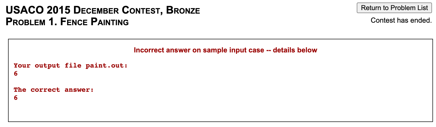 You must rename the .in and .out files depending on the problem. For example, in the above problem you would use paint.in and paint.out.