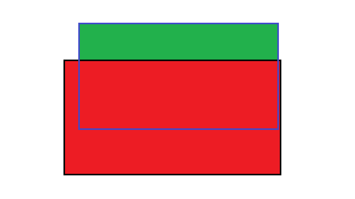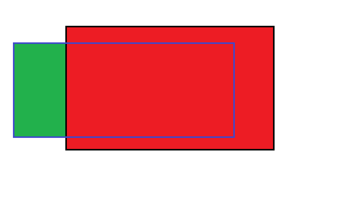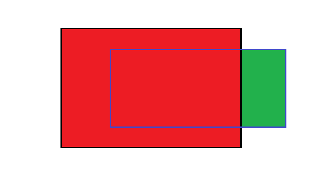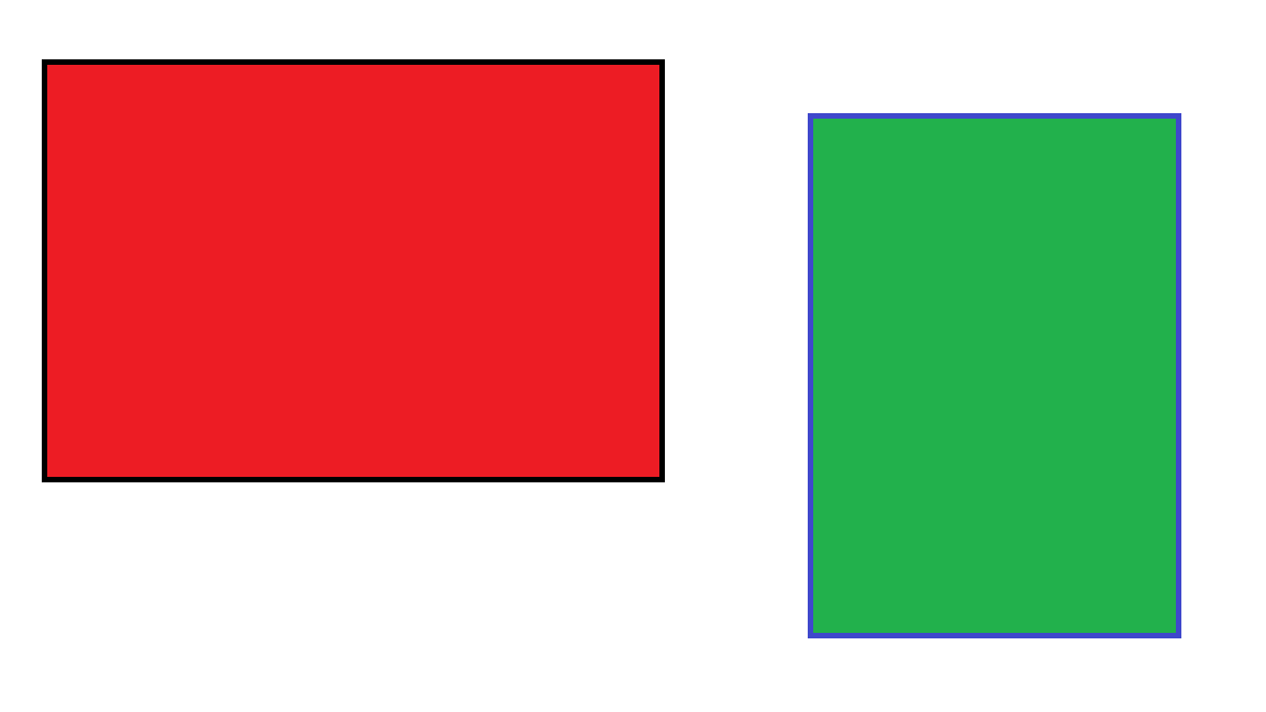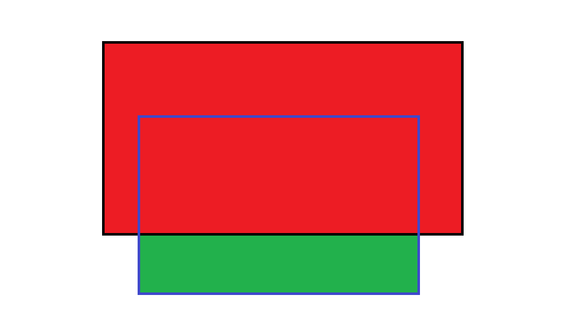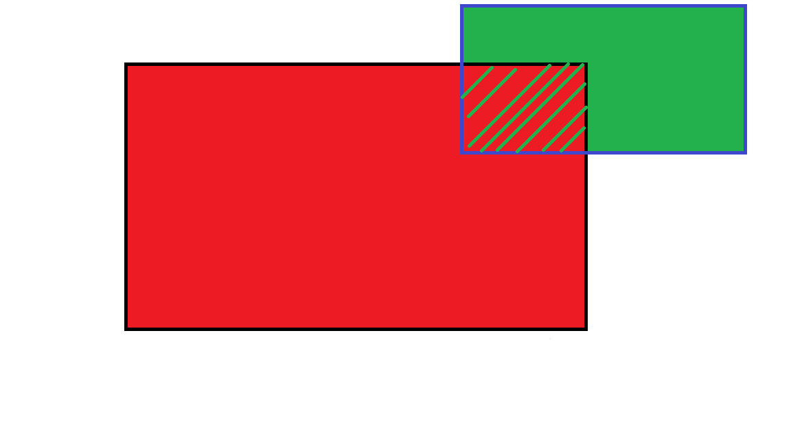 I will use the images to visualize the cases, so note these things: The red color shows the area covered by the second rectangle (whose borders are black), while the green one represents the area of the first rectangle (whose edges are blue). If two rectangles intersect, the red color will appear as the cow feed billboard block the lawnmower billboard.